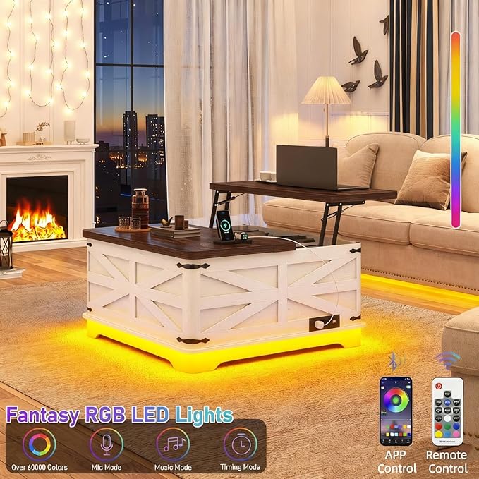 - 36" x 36" Farmhouse Square Coffee Table: Our farmhouse lift top square coffee table adopts a unique 36" x 36" large size design and tabletop's corners feature a curved profile design, creating a smooth curve. Classic barn door appearance, rustic original wood grain finish, metal corners and colorful LED lights combine to add a strong farmhouse atmosphere and complement living rooms.