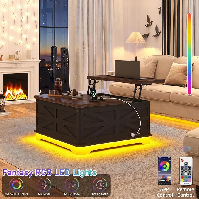 - With Convenient Charging Station and LED Lights: Large living room center table side features a charging station, including 2 power outlets, 2 USB ports and 1 type C port, to meet your various charging needs. Provide charging needs for your laptops, mobile phones, iPads and game devices at all times. Lift LED coffee table also has beautiful RGB LED lights that can adjust various colors, including timing and music functions, and giving the entire room an attractive atmosphere.