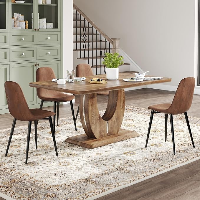 Wooden Dining Table Set for 4,63" Rectangular Kitchen Table with Upholstered Chair, Modern Dining Room Furniture with Faux Leather Seating and Sturdy Metal Legs, Brown Farmhouse Table Set