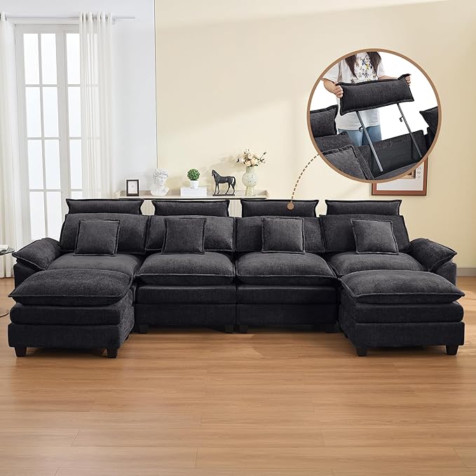 134'' Cloud Modern 4 Seater Couch with Detachable Headrest, Modular Sectional Sofa with 2 Ottoman, Oversized U Shape Chenille Comfy Sofa with Armrests for Living Room, Dark Grey