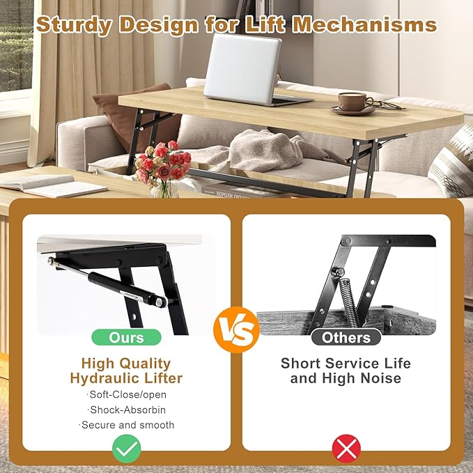 - 1. Lift-Top Coffee Table: The modern coffee table's top effortlessly raises to the correct height (up to 6.3 inches). The versatile gas-operated lift provides smooth and safe lifting. The design features a slow-rebound hydraulic support rod that effortlessly raises and lowers the table, allowing you to work, write, or dine comfortably on the sofa.