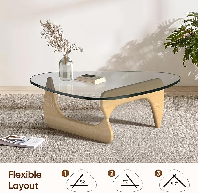 Triangle Glass Coffee Table with Solid Wood Base, 0.8'' Thick Clear Glass Top, 51'' Width Mid Century Modern Coffee Table for Living Room Bedroom Reception (Original Wood)