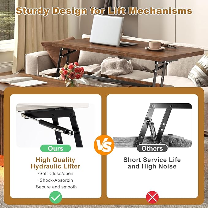 - 1. Lift-Top Coffee Table: The modern coffee table's top effortlessly raises to the correct height (up to 6.3 inches). The versatile gas-operated lift provides smooth and safe lifting. The design features a slow-rebound hydraulic support rod that effortlessly raises and lowers the table, allowing you to work, write, or dine comfortably on the sofa.