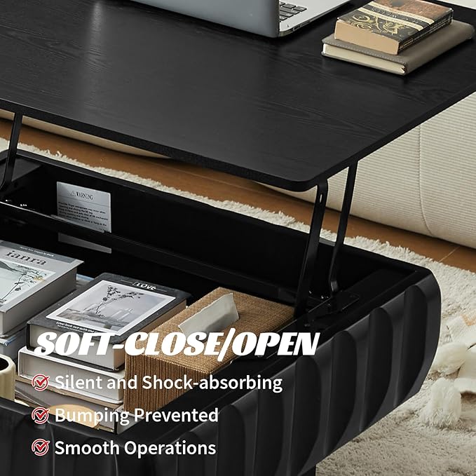 31" Lift Top Coffee Table for Living Room, Fluted Coffee Table with Hidden Storage Compartment, Mid Century Modern Solid Wood Veneer Square Center Table for Office Apartment Small Space, Black