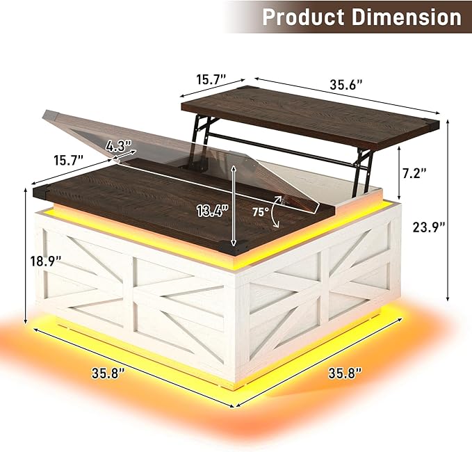 - Large Hidden Storage Space: Wooden coffee table on both sides can be lifted, there is a large space for you to hold blankets, pillows, books, notebooks, toys, snacks, game consoles, and whatever you need to hide or stow away. Keeping them away from dust and your living room tidy and clean at all times. 36" x 36" large top surface space is spacious enough for home décor, coffee table, drinks, eats and more.
