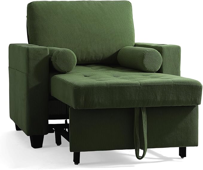 UIXE 3-in-1 Sleeper Chair Pull Out Sofa Bed, Convertible Reclining Seat Upholstered Armchair, Adjustable Backrest Recliner Chair with Side Pockets, Cup Holder & USB Ports - Green