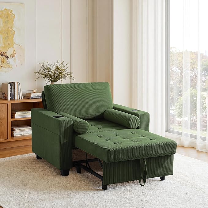 - 3-IN-1 Convertible Sofa Bed - 3 adjustable backrest positions (95°, 145°, and 180°) and a retractable pull-out bed. Pull out the under-seat bed frame and easily transform it into an accent chair, a lounge chair or a comfortable sofa bed to meet your needs. Whether you want to rest or have guests staying overnight, it can offer practical solutions. Space-saving and suitable for small spaces!