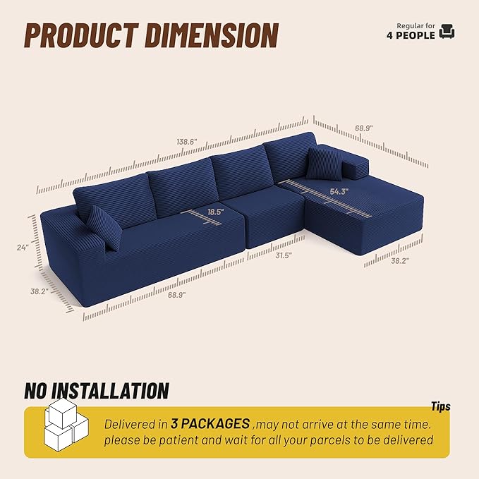 138" Boneless Couch with Deep Seat, Modular Sectional Sofa, Cloud Sectional Couch for Living Room, No Assembly Required, Corduroy, 4 Seater L-Shape Right, Blue