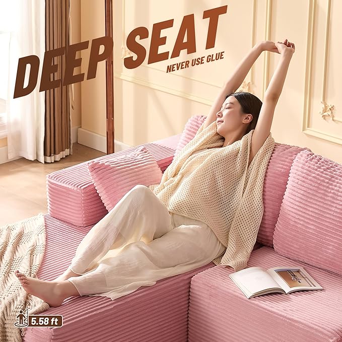 107" Boneless Couch with Deep Seat, Modular Sectional Sofa, Cloud Sectional Couch for Living Room, No Assembly Required, Corduroy, U-Shape 3 Seater Left, Pink