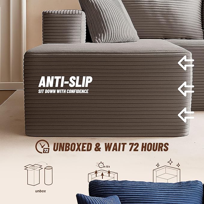 107" Boneless Couch with Deep Seat, Modular Sectional Sofa, Cloud Sectional Couch for Living Room, No Assembly Required, Corduroy, U-Shape 3 Seater Left, Gray