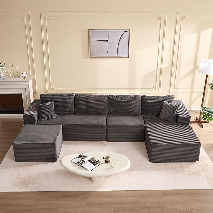 138" Boneless Couch with Deep Seat, Modular Sectional Sofa, Cloud Sectional Couch for Living Room, No Assembly Required, Corduroy, U-Shape 4 Seater Right, Gray
